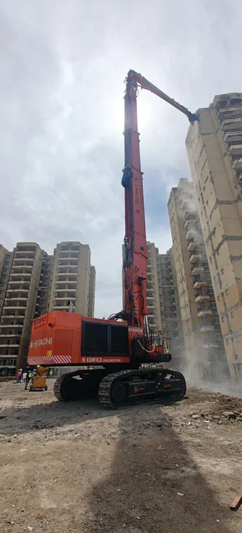 The EX1200V excavator, supplied by Tata Hitachi, has been integrated by Edifice Engineering with a specialised high-reach demolition attachment, making it one of Asia’s tallest demolition machines in operation today. Designed for dismantling tall structures safely and efficiently, the attachment features a telescopic boom configuration, enabling the machine to operate at a safe working height of up to 51 metres, making it capable of demolishing structures of up to approximately 17 floors.