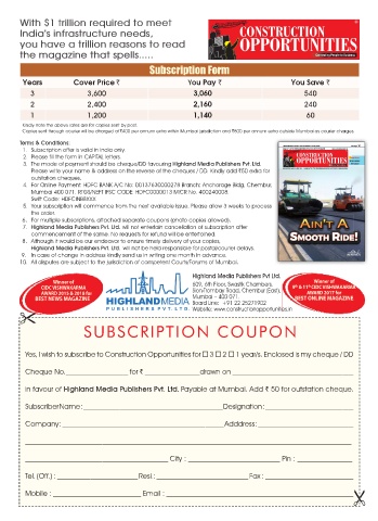 1. Subscription offer is valid in India only. RNI No. MAHENG/2014/56033. Date of Publication 5 th of every month. www.constructionopportunities.in Total Pages 52
