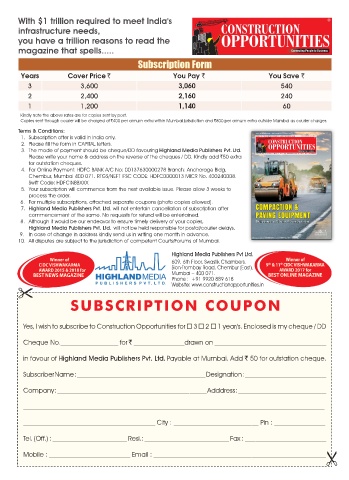 1. Subscription offer is valid in India only. Winner of 7 th & 10 th CIDC VISHWAKARMA AWARD 2015 & 2018 for BEST NEWS MAGAZINE www.constructionopportunities.in