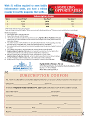 With $1 trillion required to meet India's infrastructure needs, you have a trillion reasons to read the magazine that spells..... Subscription Form Years Cover Price ` You Pay ` You Save ` 3 2,160 1,836 324 2 1,440 1,296 144 1 720 648 72 Kindly note the above rates are for copies sent by post. Copies sent through courier will be charged at `360 per annum extra within Mumbai jurisdiction and `720 per annum extra outside Mumbai as courier charges. Terms & Conditions: 1. Subscription ofer is valid in India only. 2. Please fll the form in CAPITAL letters. 3. The mode of payment should be cheque/DD favouring Highland Media Publishers Pvt. Ltd. Please write your name & address on the reverse of the cheques / DD. Kindly add `50 extra for outstation cheques. 4. For Online Payment: HDFC BANK A/C No: 00137630000278 Branch: Anchorage Bldg, Chembur, Mumbai 400 071. RTGS/NEFT IFSC CODE: HDFC0000013 MICR No. 400240008. 5. Your subscription will commence from the next available issue. Please allow 3 weeks to process the order. 6. For multiple subscriptions, attached separate coupons (photo copies allowed). 7. Highland Media Publishers Pvt. Ltd. will not entertain cancellation of subscription after commencement of the same. No requests for refund will be entertained. 8. Although it would be our endeavor to ensure timely delivery of your copies, Highland Media Publishers Pvt. Ltd. will not be held responsible for postal/courier delays. 9. In case of change in address kindly send us in writing one month in advance. 10. All disputes are subject to the jurisdiction of competent Courts/Forums of Mumbai. Highland Media Publishers Pvt Ltd. 609, 6th Floor, Swastik Chambers, Sion-Trombay Road, Chembur (East), Mumbai – 400 071. Board Line: +91 22 25271902/03 Website: www.constructionopportunities.in SubScription coupon Yes, I wish to subscribe to Construction Opportunities for 3 2 1 year/s. Enclosed is my cheque / DD Cheque No._________________ for ` _______________drawn on ___________________________________ in favour of Highland Media Publishers Pvt. Ltd. Payable at Mumbai. Add ` 50 for outstation cheque. Subscriber Name : ______________________________________ Designation : ________________________ Company : _______________________________________ _____ Adddress : __________________________ _________________________________________________________________________________________ _______________________________________ City : _________________________ Pin : _______________ Tel. (Of.) : ______________________ Resi.: _________________________ Fax : ________________________ Mobile : ________________________ Email : ____________________________________________________